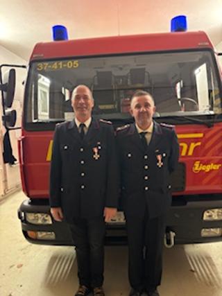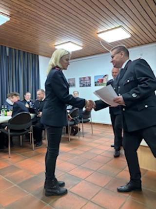 Im Rahmen der Versammlung wurden eine Kameradin zur Oberfeuerwehrfrau befördert sowie zwei Kameraden für 25 Jahre aktiven Feuerwehrdienst mit dem Feuerwehr-Ehrenkreuz in Silber am Bande geehrt.